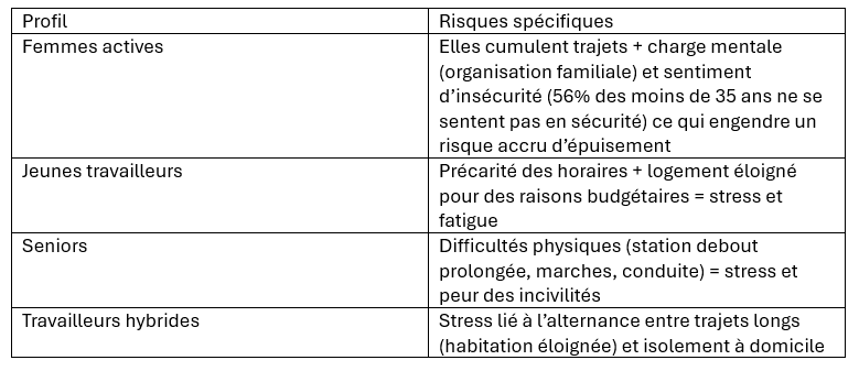 Tous les usagers ne sont pas égaux face au stress des trajets. Certains profils sont plus à risque et particulièrement vulnérables. Il est d’ailleurs intéressant d’observer que les transports du quotidien agissent comme un amplificateur de vulnérabilité : surcharge domestique, précarité, inégalités sociales et professionnelles, injonction à la disponibilité permanente.